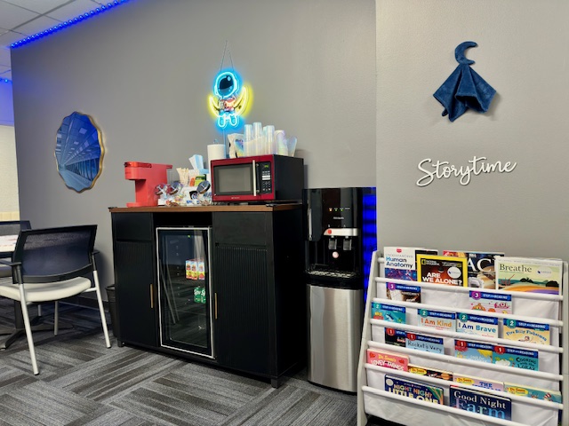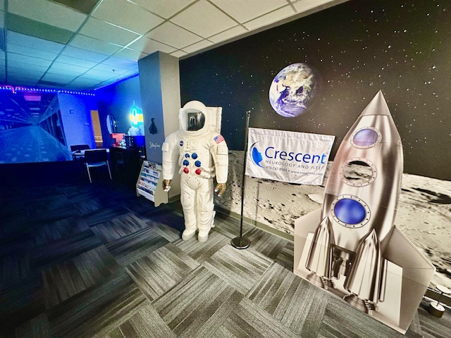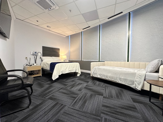 Each room in the space-themed 3-bed sleep lab has a full-size adjustable bed for the patient, a separate twin bed for a caregiver if applicable, and adjustable thermostat control for maximum comfort. The lab has one shared bathroom. There is no shower on the premises.